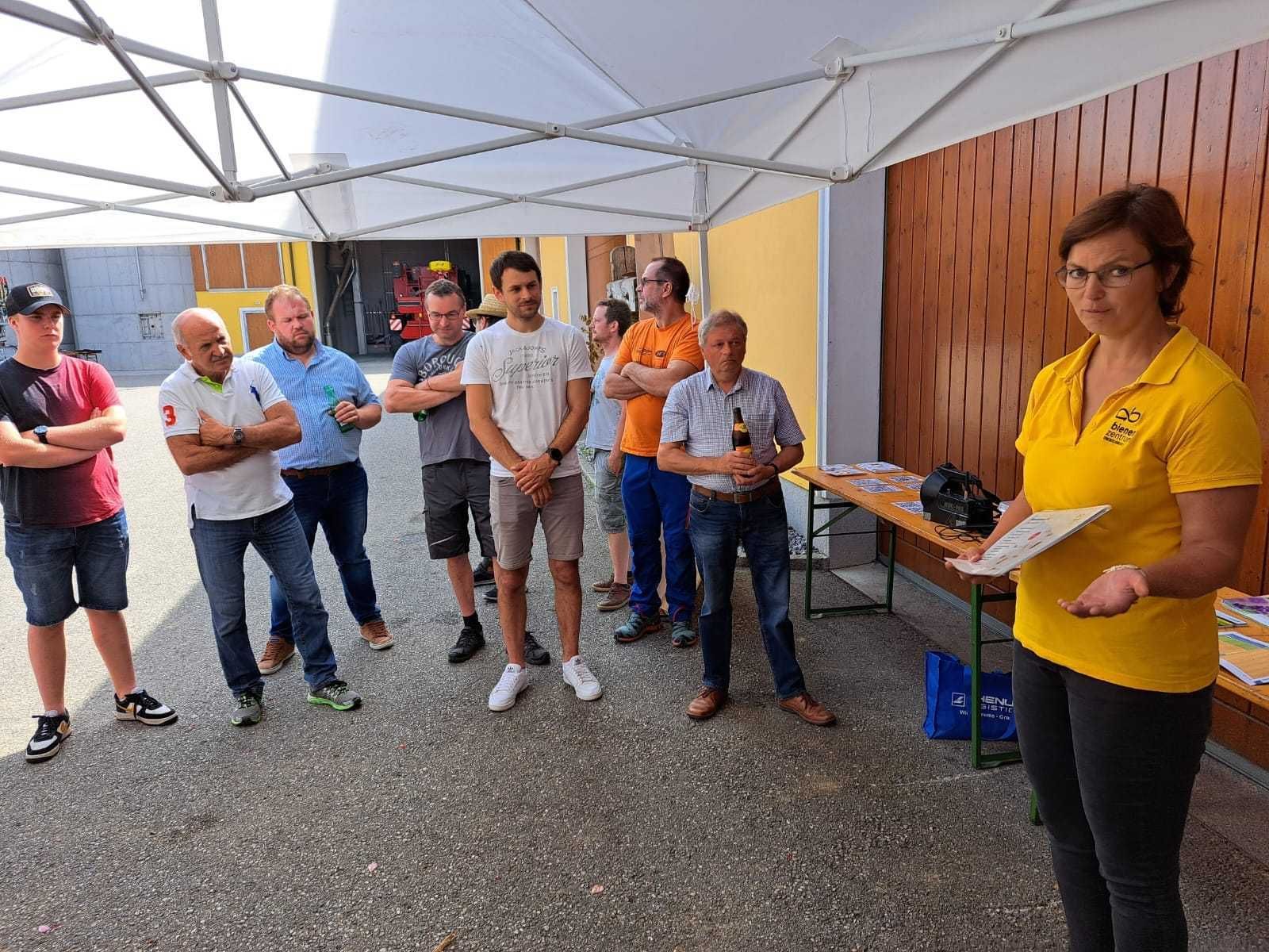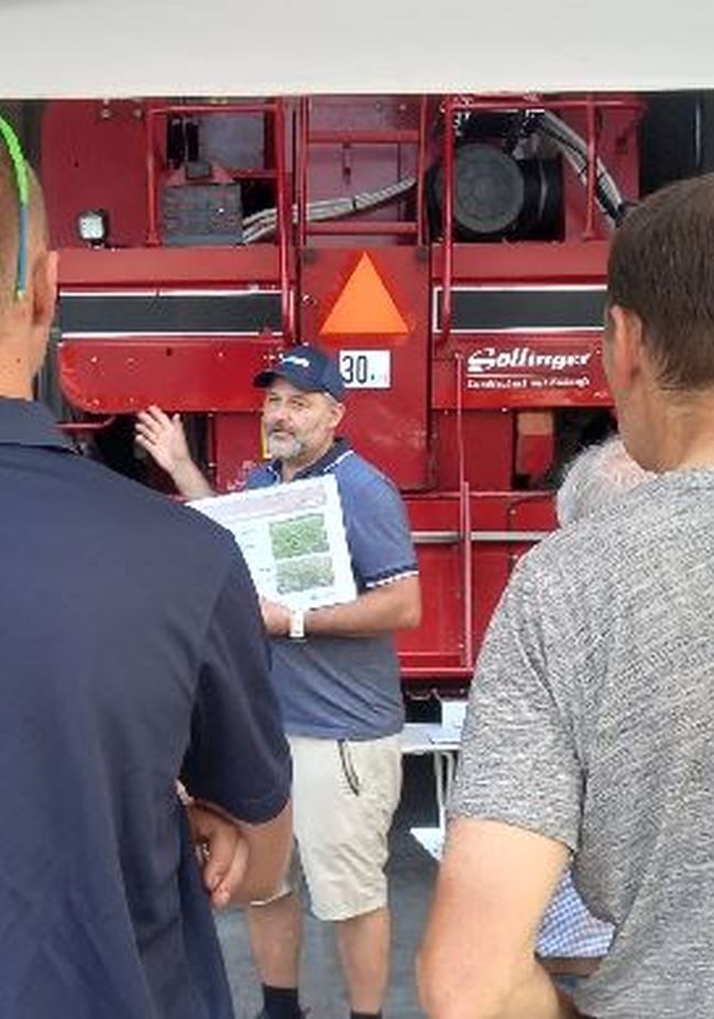 Michael Treiblmeier von Blickwinkel und Christoph Ömer von BWSB - Boden.Wasser.Schutz.Beratung stellten zwei neue Formen der Begrünungssaat in Form von Drohnensaat und Mähdruschsaat vor. Darüber hinaus erklärte Elisabeth Lanzer vom Bienenzentrum OÖ die Bedeutung der frühen Blühte der Zwischenfrüchte für die Vitalität der Winterbienen und Norbert Ecker von Agrar-EN erläuterte mit Hilfe von Wiegeplatten und Bodenproben Achslasten und Bodendruck.